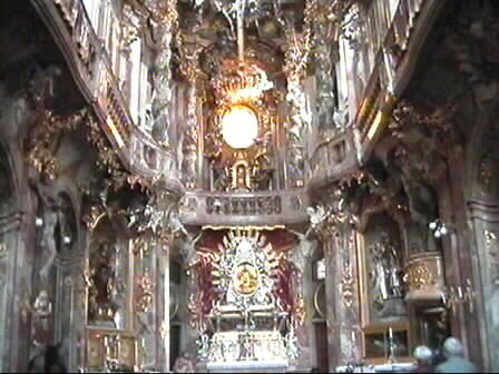 Der erste Anblick des Innenraums der Asamkirche ist atemberaubend und überfordert die Wahrnehmungsfähigkeit des Auges. Eine Vielzahl von Plastiken, Fresken und Schnitzereien sind hier als Komposition zusammengefügt, für die einen ein Meisterwerk, auf andere jedoch wirkt sie überladen und "kitschig".