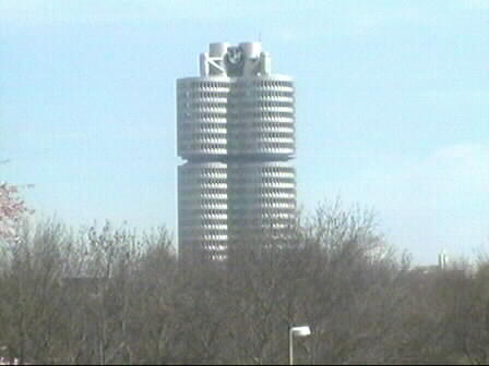Am Rande des Olympiaparks erhebt sich das 99m hohe Verwaltungsgebäude von BMW in Form eines Vierzylinders.